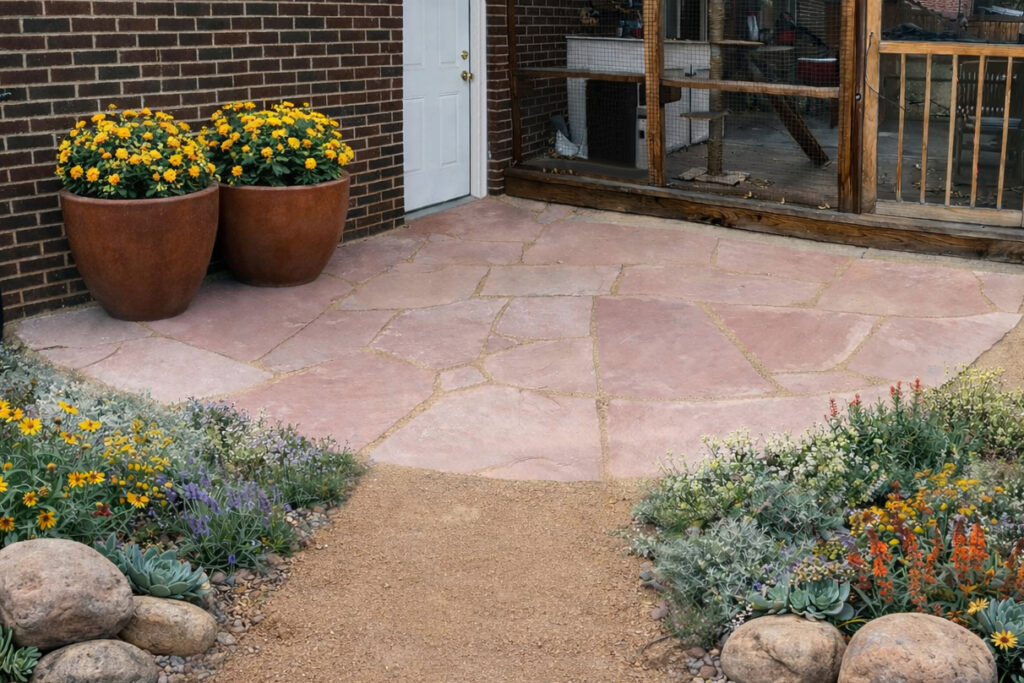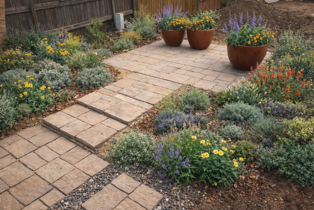 This flagstone patio installation with native plants and diverse drought tolerant species will give the client so much more outdoor interest, space for seating, while supporting a thriving backyard ecosystem.