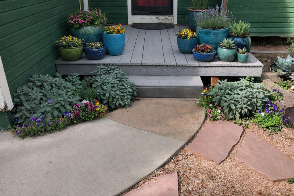 Perennials like sage anchor this entry path, with shorter violets and annual pansies to bring lasting beauty added in front. Water wise drip irrigation keeps this client’s utility bill low.