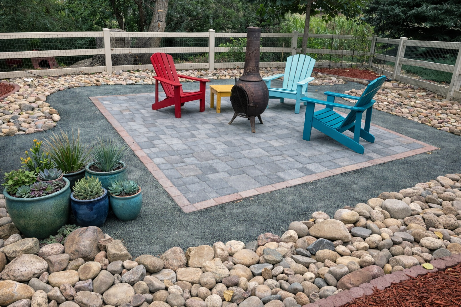 This paver patio was built with a compacted breeze surround, locking in the installation while stabilizing the project for seating and outdoor season extension around the fire.